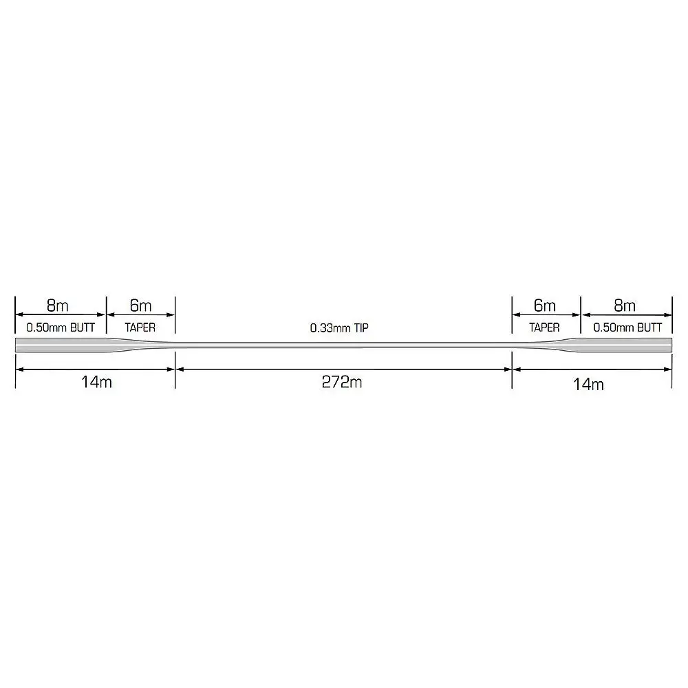 Double Taper bedeutet, dass die Schnur einmal gewendet werden kann, und Sie damit einen größeren Gegenwert für Ihr Geld erhalten. Sie startet bei sehr starken 35lb (0,50 mm) über 8m, verjüngt sich dann über die nächsten 6 m auf entweder 12lb (0,30 mm) oder 15 lb (0,33 mm), dann kommen 300m 12 oder 15 lb Schnur, bevor es dann wieder nach oben hin dicker wird auf 35lb (wieder 6m tapered und 8 m x 35lb).